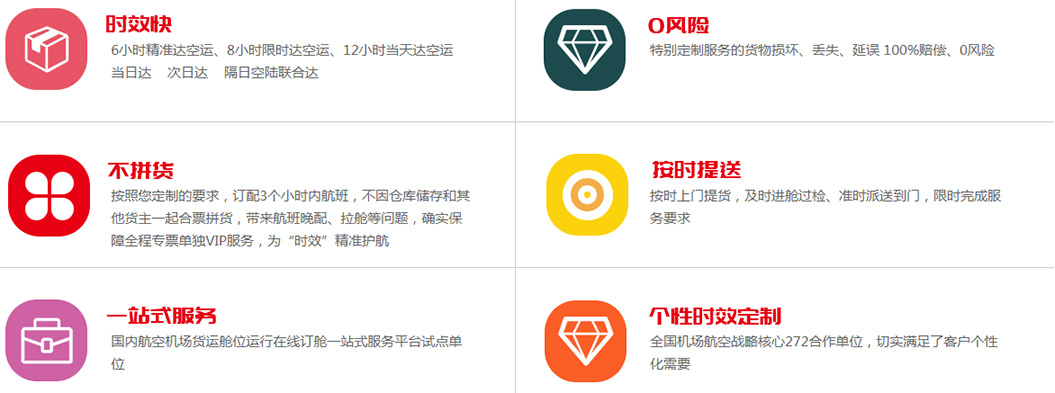 全国130多家空运代理,准时派送。 专人专线航班配载,航班跟踪。 从收货到提货全程监控,实时信息反馈,确保货物安全。 1 国营的运输网络(含国航.南航.东航.海航.厦航.川航等各大航空公司) 为您提供正规,标准,高品质的服务 2 全天候信息服务系统:货物全程动态跟踪并及时向收发货放反馈信息,保证急件准时,安全送达 1 有专人为您解决任何货物运输的疑问 2 接单专员24小时一对一跟进,全程避免转接客服,推给其他人员跟进,省心便捷的体验 | ![]() |